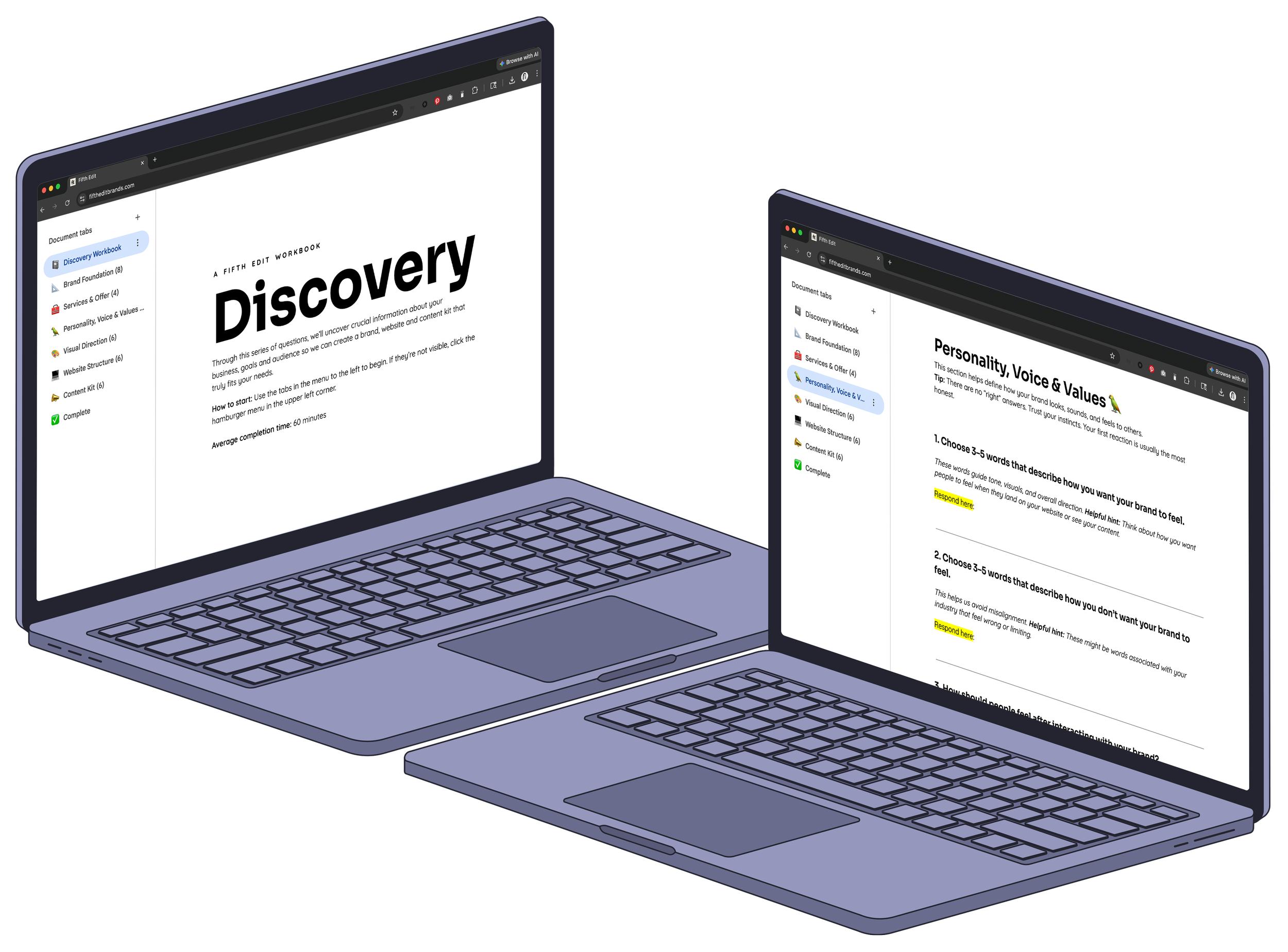 The Brand Incubator is a done-for-you experience. We handle the heavy lifting so you can remain focused on running your business. To keep things moving within the five-week timeline, you’ll need to check your client portal daily (you’ll also get email notifications) for quick approvals or feedback.